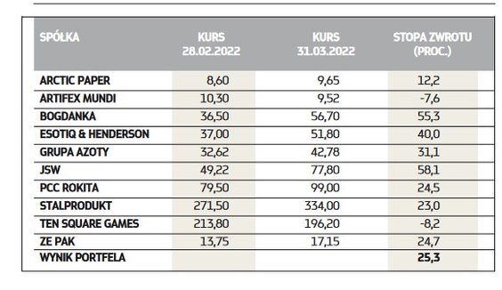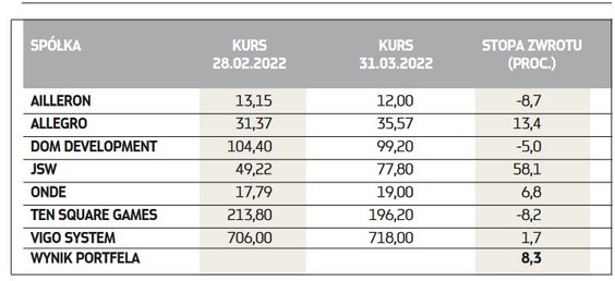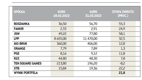 Choć tegoroczne miesiące były bardzo burzliwe dla posiadaczy akcji to bilans pierwszego kwartału wypada pozytywnie dla uczestników rywalizacji portfeli fundamentalnych. Straty z lutowej przeceny, wywołanej rosyjską inwazją na Ukrainę, już w marcu sprawnie udało się odrobić. Duża w tym zasługa poprawy nastrojów wśród inwestorów handlujących na warszawskiej giełdzie. Główne indeksy odrobiły straty i wróciły do poziomów tuż sprzed wybuchu wojny. Wciąż im jednak trochę brakuje do poziomów z początku roku.