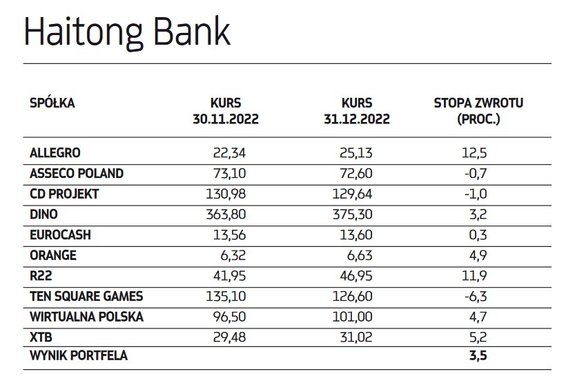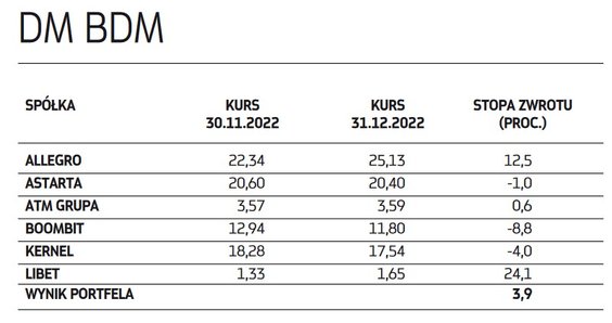 Kto najlepiej typował w 2022 r.? Najlepszym wynikiem mogą się pochwalić analitycy Domu Maklerskiego BDM, którzy wypracowali efektowną, ponad 54-proc. stopę zwrotu z portfela, poprawiając swoje osiągnięcie sprzed roku o jedną pozycję. Udało im się tego dokonać dzięki solidnemu wynikowi portfela w grudniu i jednocześnie nieoczekiwanej wpadce głównego konkurenta, dzięki czemu dopiero na ostatniej prostej wysunęli się na prowadzenie. Tuż za liderem uplasowali się eksperci BM Banku Millennium, którzy dzięki udanemu typowaniu przewodzili w rankingu przez 11 miesięcy minionego roku, by ostatecznie na finiszu roku przegrać rywalizację o pierwsze miejsce. Ich ubiegłoroczne inwestycje przełożyły się na prawie 46 proc. zysku. Na trzeciej pozycji uplasowali się analitycy z Haitong Banku, których portfel jest prawie 21 proc. na plusie.