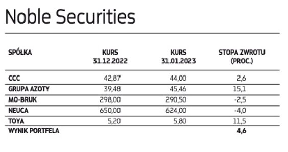 Wytypowane przed miesiącem spółki w większości przypadków nie zawiodły uczestników naszej gry, wypracowując solidne stopy zwrotu. A ponieważ zwycięskiego składu się nie zmienia, to w lutym do istotnych roszad w składach portfeli nie doszło. Eksperci wychodzą z założenia, że dobra passa ich spółek w tym miesiącu będzie kontynuowana. Tam, gdzie jednak pojawiły się zmiany, wynikały one z chęci zrealizowania przez ekspertów części zysków. To był główny argument przemawiający za pozbyciem się walorów z portfela. Ich miejsce zajęły nowe, tańsze i w ocenie samych typujących bardziej obiecujące walory. Analizując propozycje na kolejny miesiąc, można zauważyć wśród typujących spadek zaufania do największych spółek. Widać, że po noworocznej fali zwyżek wielu małych spółek i słabszym zachowaniu przedstawicielu indeksu WIG20 niektórzy z nich zmienili taktykę, zwiększając zaangażowanie w akcje mniejszych firm. W dalszym ciągu trzymają w portfelach walory takich tuzów, jak PKN Orlen czy CD Projekt, ale równocześnie szerokim łukiem omijając takie sektory, jak banki, gdzie jednym z istotnych ryzyk, które wypłynęło w ostatnich tygodniach, jest perspektywa wydłużenia wakacji kredytowych, co oznaczałoby dla sektora dodatkowe, istotne koszty. Dlatego eksperci swojej szansy szukają na szerokim rynku akcji, który prezentuje się atrakcyjniej niż segment dużych firm. W przypadku wielu spółek, które wpadły w oko naszym ekspertom, kluczowe znaczenie miał rozpoczęty właśnie sezon publikacji raportów za IV kwartał i cały 2022 rok (zdecydowana większość spółek jest przed ich publikacją). Mimo coraz bardziej wymagającego otoczenia, nie brakuje spółek, które mogą się pochwalić rosnącymi biznesami, notując efektowną poprawę wyników finansowych, i to głównie wśród nich eksperci szukali okazji. Dlatego wśród zgłoszonych propozycji na luty nie mogło zabraknąć miejsca dla takich spółek, jak Ailleron, Arctic Paper, CD Projekt Mostostal Zabrze, PKP Cargo czy Torpol.