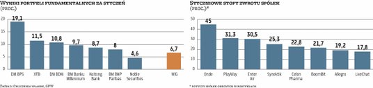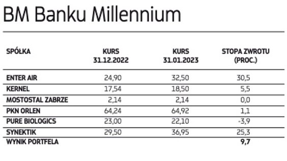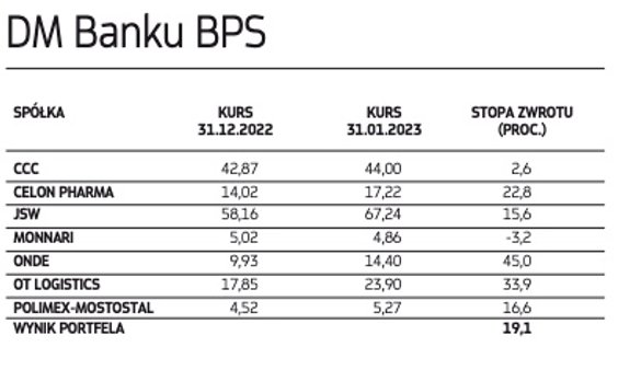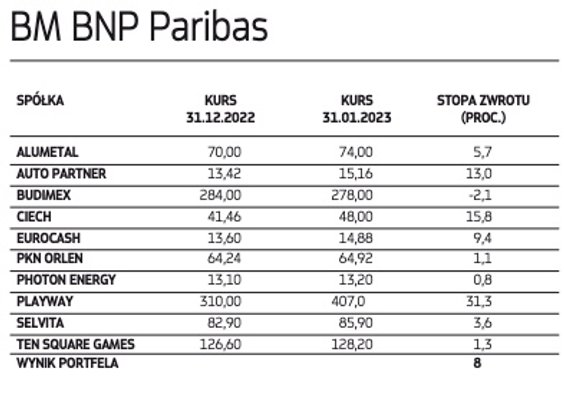 Przed miesiącem wystartowała jedenasta już edycja portfeli fundamentalnych „Parkietu”. Do rywalizacji w 2023 roku przystąpiło siedem domów maklerskich. Ich zadaniem jest typowanie spółek z mocnymi fundamentami, które zapewnią ich portfelom jak najlepszą stopę zwrotu. Po pierwszym miesiącu eksperci biorący udział w rywalizacji mogą mieć powody do zadowolenia, rozpoczynając 2023 rok efektownymi stopami zwrotu. To w dużej mierze zasługa mniejszych spółek, które w ostatnich tygodniach pozytywnie wyróżniały się na tle rynku. Dało się jednak zauważyć zmianę nastawienia inwestorów, którzy coraz łaskawszym okiem spoglądali na akcje giełdowych „maluchów”, pozwalając wielu z nich wypracować efektowne stopy zwrotu. Równocześnie nieco w tyle zostały największe spółki, które w drugiej połowie stycznia weszły w korektę.