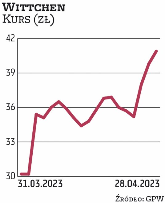 W kwietniu zwyżka notowań Wittchena przyspieszyła, a spółka należała do najbardziej rozchwytywanych na warszawskim parkiecie. Akcje sieci sklepów z galanterią skórzaną i walizkami zdrożały o ponad 35 proc. Inwestorów przekonały do zakupów rewelacyjne dane o sprzedaży za I kwartał – przychody grupy wyniosły 96,5 mln zł i były o 50 proc. wyższe niż rok wcześniej. W końcówce miesiąca zarząd spółki przedstawił rekomendację wypłaty sowitej dywidendy, która została entuzjastycznie przyjęta przez rynek. Do akcjonariuszy miałoby trafić ponad 60 mln zł, co oznaczałoby wypłatę 3,33 zł na akcję. Przy aktualnym kursie daje to stopę dywidendy na atrakcyjnym poziomie ponad 8 proc.
