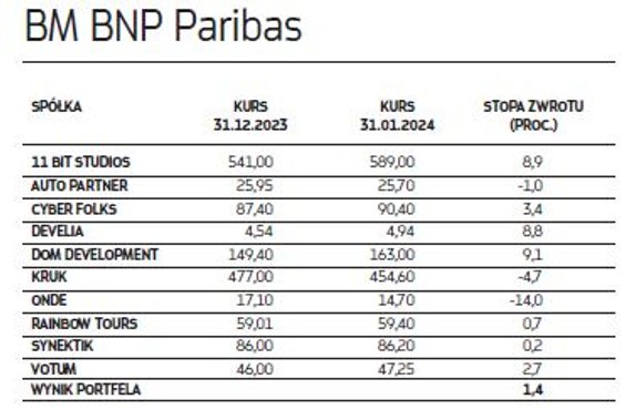 Przed miesiącem wystartowała 12. edycja portfeli fundamentalnych „Parkietu”. Do rywalizacji w 2024 r. przystąpiło pięć domów maklerskich. Ich zadaniem jest typowanie spółek z mocnymi fundamentami, które zapewnią jak najlepszą stopę zwrotu. Po pierwszym miesiącu eksperci mogą mieć jedynie umiarkowane powody do zadowolenia. Styczniowe ochłodzenie nastrojów na warszawskim parkiecie sprawiło, że trzy z pięciu portfeli zanotowały stratę. Rozczarowały zwłaszcza obecne w portfelach walory spółek z indeksu WIG20, jak Cyfrowy Polsat, CD Projekt, Kruk czy Orlen, którym styczniowa przecena mocno dała się we znaki. Na szczęście udział dużych spółek w portfelach nie był znaczący.
