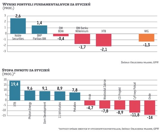 Uśredniony styczniowy wynik wszystkich portfeli fundamentalnych wypadł symboliczne 0,02 proc. na minusie. Stopa zwrotu uzyskana przez brokerów była jednak wyraźnie lepsza od wyniku szerokiego rynku WIG, który z minionym miesiącu stracił ok. 1,3 proc.