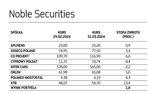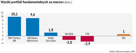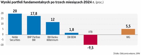 W zakończonym miesiącu portfele ekspertów biorących udział w typowaniu spółek o mocnych fundamentach poradziły sobie ze zmiennym szczęściem. Warunki do zarabiania na krajowym rynku akcji w tym okresie nie były bowiem wybitnie sprzyjające. Niby mamy hossę, ale w porównaniu z 2023 rokiem tempo zwyżek głównych indeksów w I kwartale wyraźnie spowolniło. W dodatku spora grupa spółek jest pomijana przez inwestorów, co znajduje odzwierciedlenie w ich rozczarowujących stopach zwrotu w 2024 roku. To pokazuje, jak istotne znacznie ma selekcja firm.