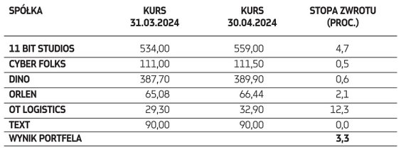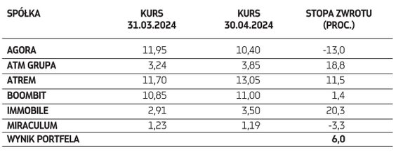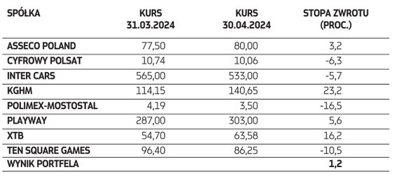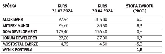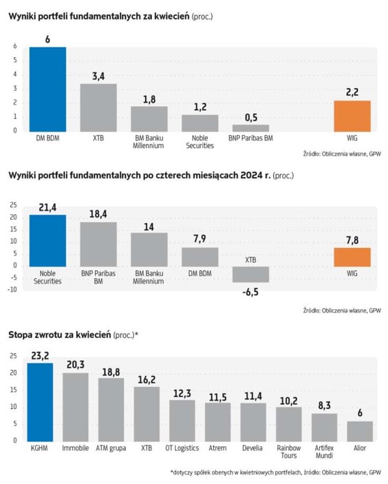 Stopy zwrotu z portfeli utworzonych z wytypowanych przed miesiącem spółek okazały się lepsze nie tylko od wyniku szerokiego rynku (WIG zyskał w kwietniu 2,2 proc.), ale również od portfela tworzonego na łamach „Parkietu” przez analityków technicznych, który podsumowaliśmy we wtorkowym wydaniu. Ten ostatni w minionym miesiącu był 1,5 proc. na plusie, podczas gdy średni wynik wszystkich portfeli fundamentalnych wyniósł ponad 2,5 proc.