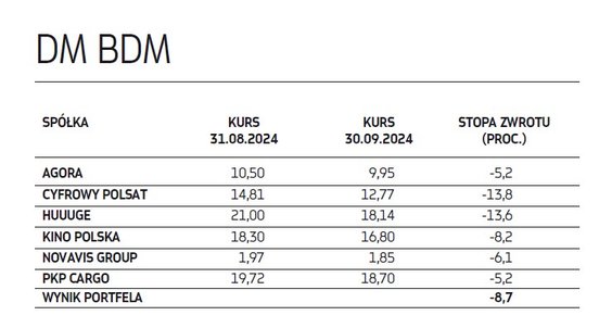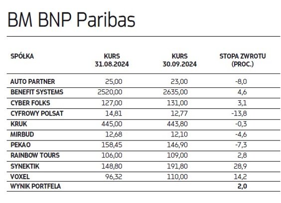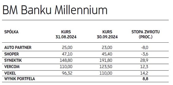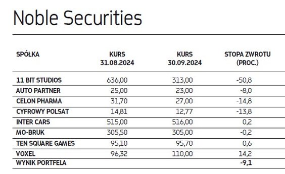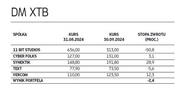 Wytypowane przed miesiącem spółki niestety w większości przypadków nie spełniły pokładanych w nich nadziei na zyski. Największym rozczarowaniem były akcje 11 bit studios, których notowania załamały się pod koniec września (w skali całego miesiąca spadek wyniósł ponad 50 proc.) po premierze „Frostpunka 2”, z którą rynek wiązał ogromne nadzieje. Pierwsze dane o zainteresowaniu grą i recenzje jednak szybko je rozwiały, boleśnie urealniając wycenę giełdową gamingowej spółki, co miało istotny wpływ na wrześniowy wynik dwóch portfeli naszych ekspertów. Na drugim biegunie wśród najmocniej drożejących znalazły się natomiast papiery Synektika, które w ciągu miesiąca poprawiły swoje notowania o blisko 29 proc., a stopa zwrotu od początku tego roku to już blisko 130 proc. To efekt rosnących oczekiwań względem spółki, która rozwija się w imponującym tempie. Jest bowiem beneficjentem szybko rozwijającego się rynku chirurgii robotycznej i nie ma problemów z pozyskiwaniem zleceń na dostawy kolejnych robotów do placówek medycznych w Polsce i kilku innych krajach z naszego regionu. Akcje Synektika znalazły się aż w trzech portfelach i mimo imponującej zwyżki w tym roku dwa nadal widzą w nich potencjał.
