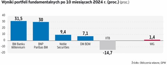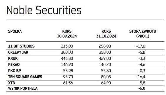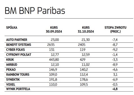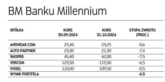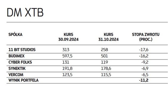 Największy zawód wśród walorów obecnych w październikowych portfelach sprawiły akcje producentów gier: 11 bit studios i Ten Square Games (obecne w dwóch portfelach), które w skali całego miesiąca przyniosły ich posiadaczom kilkunastoprocentowe straty. Słabsza od oczekiwań premiera „Frostpunka 2” najwyraźniej podkopała zaufanie do całej branży, ciążąc notowaniom spółek gamingowych. Mocno rozczarował także Budimex, którego akcje w październiku pogłębiły korektę. Od majowego szczytu ich wartość stopniała już o ok. jedną trzecią, a końca spadków jak na razie nie widać. Negatywnego nastawienia do budowlanego potentata, którego papiery jeszcze kilka miesięcy temu efektownie drożały, nie były w stanie zmienić solidne wyniki finansowe za III kwartał tego roku i niezłe perspektywy.