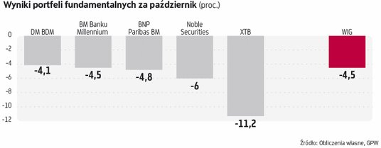 Zakończony niedawno miesiąc wypadł dużo mniej udanie od poprzednich. Korekta, która przyspieszyła w październiku, zabrała część wcześniej wypracowanych zysków, co sprawiło, że w skali całego miesiąca WIG znalazł się 4,5 proc. pod kreską, cofając się na finiszu miesiąca niemal do poziomu z początku tego roku. Był to zdecydowanie najsłabszy miesiąc w tegorocznej rywalizacji portfeli fundamentalnych pod względem wypracowanych przez uczestników stóp zwrotu.
