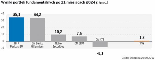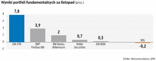 Mimo zawirowań na krajowym parkiecie w listopadzie, tym razem wszystkie biura maklerskie biorące udział w rywalizacji portfeli fundamentalnych mogły się pochwalić zyskami. Warto to docenić, bo nie był to spokojny okres dla posiadaczy akcji. Po wyborczej wygranej Donalda Trumpa oraz wskutek nowych gróźb Władimira Putina nasz parkiet znów zaczął być postrzegany jako rynek podwyższonego ryzyka, co zachwiało krajowymi indeksami, choć już w drugiej połowie miesiąca nastroje uległy wyraźnej poprawie i wskaźniki częściowo zdołały odrobić straty. Najmocniej te zawirowania odczuli posiadacze walorów największych firm. Nieco bardziej odporne okazały się mniejsze spółki, mające dużo większą reprezentację w portfelach naszych ekspertów.