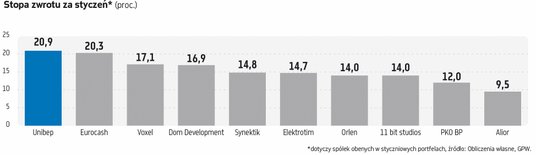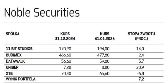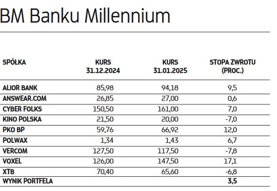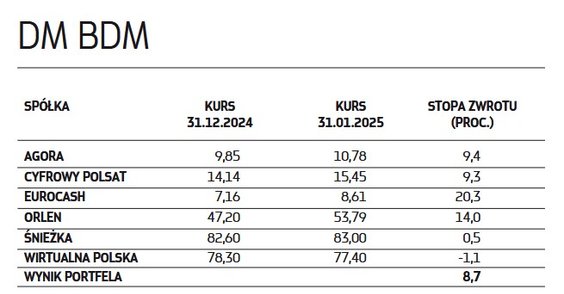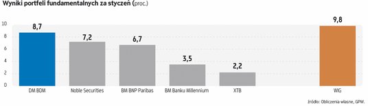 W styczniu zdecydowanie najlepszym rezultatem mogą się pochwalić analitycy DM BDM. Wytypowane przed ponad miesiącem spółki przyniosły 8,7 proc. zysku z portfela. Za ich plecami uplasowali się eksperci Noble Securities, których inwestycje przyniosły wynik na poziomie 7,2 proc. W pierwszej trójce znaleźli się również triumfatorzy zeszłorocznej edycji portfeli, analitycy BM BNP Paribas, wypracowując stopę zwrotu na poziomie 6,7 proc.