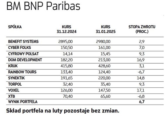 Przed miesiącem wystartowała 13. edycja portfeli fundamentalnych „Parkietu”. Do rywalizacji w 2025 roku przystąpiło sześć domów maklerskich (w lutym dołączyli analitycy Oanda TMS Brokers). Ich zadaniem jest typowanie spółek z mocnymi fundamentami, które zapewnią jak najlepszą stopę zwrotu z portfela. Po pierwszym miesiącu rywalizacji eksperci raczej mogą mieć powody do zadowolenia, choć jest lekki niedosyt. Porównując styczniowe stopy zwrotu, żaden z brokerów nie był w stanie dotrzymać kroku rozpędzonemu rynkowi. Na fali utrzymującego się optymizmu indeks szerokiego rynku WIG zyskał w styczniu blisko 10 proc., z kolei WIG20 w skali miesiąca poszybował w górę o prawie 11 proc., odrabiając ze sporym zapasem zeszłoroczną stratę. Tymczasem uśredniony wynik, uwzględniający rezultaty wszystkich styczniowych portfeli, wypadł 5,6 proc. na plusie i okazał się o 4,2 pkt proc. słabszy od stopy zwrotu indeksu WIG.