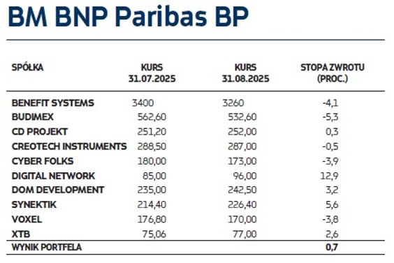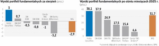 Wytypowane przed miesiącem spółki przez ekspertów biorących udział w rywalizacji portfeli fundamentalnych musiały stawić czoła rynkowej korekcie. Sporo część firm potaniała. Skala przeceny nie była jednak istotna z uwagi na to, że znaczącą część portfeli stanowiły małe i średnie spółki, z którymi korekta obeszła się łagodniej niż z uczestnikami indeksu WIG20. Mimo przeceny większość typujących nie zdecydowała się na znaczące roszady w portfelach. W dalszym ciągu trzymają się strategii polegającej na większej koncentracji na walorach firm z szerokiego rynku (poza portfelem Oanda TMS zdominowanym przez duże spóki). Ich znaczenie w porównaniu z poprzednim miesiącem jeszcze bardziej wzrosło w uwagi na wypadnięcie z portfeli akcji CD Projektu i JSW.