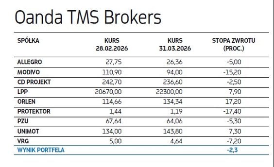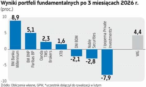 Znacznie lepszymi wynikami eksperci mogą pochwalić się, jeśli weźmiemy pod uwagę stopy zwrotu wypracowane od początku bieżącego roku, choć nie prezentują się już tak okazale, jak miesiąc wcześniej. Warto też zauważyć, że rozczarowujący marzec w dwóch przypadkach sprawił, że cały tegoroczny zysk został wymazany i w miejsce zysków pojawiły się straty. Po trzech miesiącach tegorocznej rywalizacji na prowadzeniu utrzymali się analitycy BM Banku Millennium, którzy od początku roku mogą się pochwalić stopą zwrotu wynoszącą blisko 9 proc. Tuż za ich plecami znajdują się eksperci z BM BNP Paribas Bank Polska, którzy zwiększyli stan portfela o ponad 5 proc. Na trzecim miejscu uplasowali się analitycy Oanda TMS Brokers, których inwestycje przyniosły ok. 2,3 proc. zysku. Łącznie od początku 2026 r. portfele ekspertów uczestniczących w naszej rywalizacji wypracowały średnią stopę zwrotu wynoszącą 0,7 proc., co jest wynikiem o 3,7 p.p. słabszym od rezultatu indeksu WIG, który w tym samym okresie zanotował wzrost o ok. 4,4 proc.