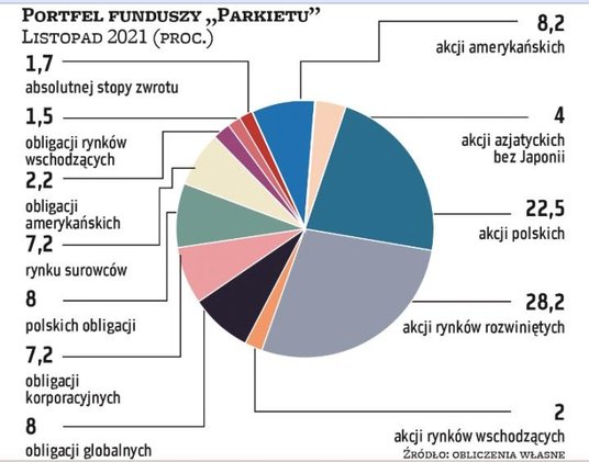 W ubiegłym miesiącu zdecydowana większość funduszy akcji przyniosła zyski. Na Wall Street indeksy wspinały się na nowe rekordy, stąd listę otwierają fundusze akcji rynków rozwiniętych. W niektórych przypadkach, np. w portfelach akcji spółek wzrostowych, najwięksi szczęściarze mogli cieszyć się z dwucyfrowych stóp zwrotu. Świetnie wypadły także fundusze metali szlachetnych. Na przeciwległym biegunie znalazły się obligacje. Szczególnie dotknięte spadkami zostały portfele obligacji długoterminowych, mocniej narażone na zmiany rynkowych stóp procentowych. To właśnie fundusze skarbowe długoterminowe, ze średnią stratą 3,2 proc., kończyły miesiąc na ostatnim miejscu w tabeli produktowej krajowych TFI. Był to efekt rosnących rentowności (spadku cen) papierów skarbowych po podwyżce stóp procentowych w październiku. W listopadzie RPP znów zaskoczyła, jednak tym razem wysokością podwyżki, co sprawiło, że rentowności papierów dziesięcioletnich przebiły na moment okrągły pułap 3 proc. W piątek doszło już do korekty, do około 2,89 proc.