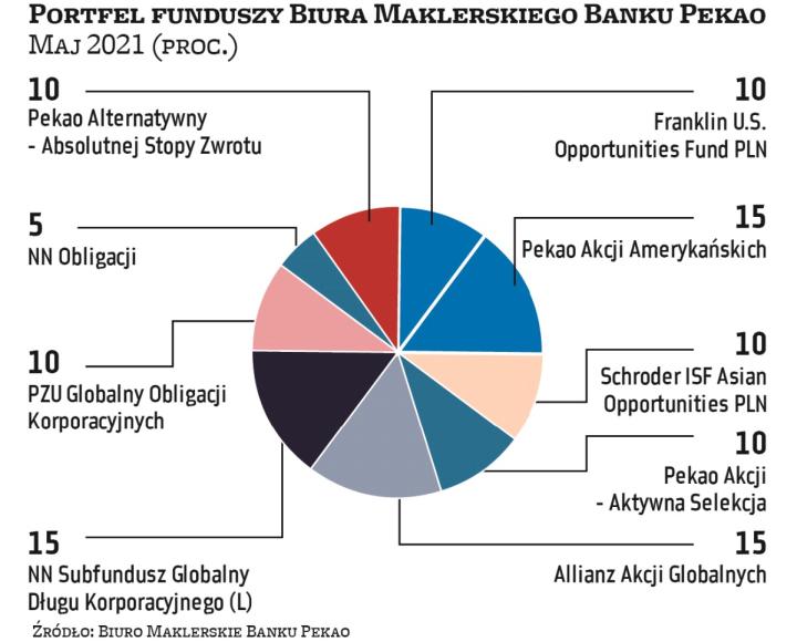 Co ciekawe, w strukturze portfeli na kolejny miesiąc praktycznie nie doszło do zmian. Również lista wybranych funduszy jest niemal identyczna z tą miesiąc wcześniej. Oznacza to, że nadal główna część aktywów ulokowana jest w akcje – to aż 66 proc. całości. Do tego należy doliczyć fundusze metali szlachetnych i innych surowców, które najczęściej w portfelach mają akcje spółek wydobywczych i innych przedsiębiorstw działających w tej branży. Łącznie daje to zatem ponad 74 proc. aktywów w papierach udziałowych firm.