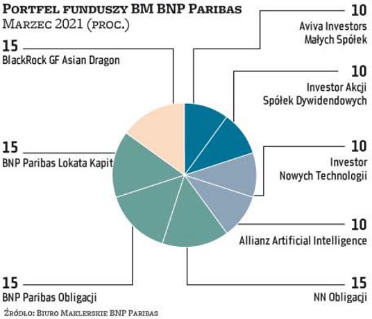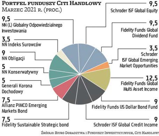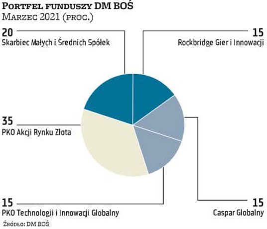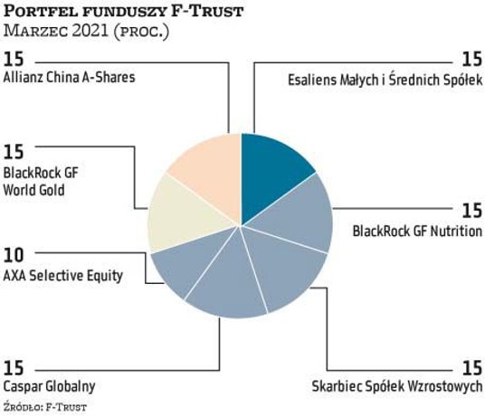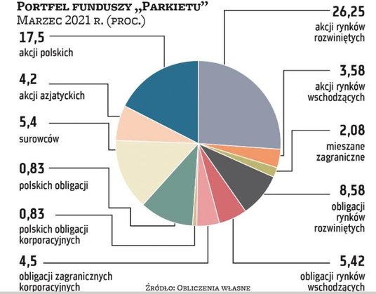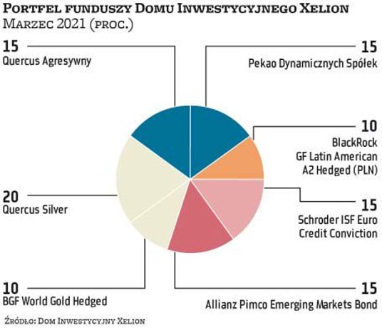 Marzec będzie ostatnim miesiącem portfela funduszy „Parkietu" w tym składzie, dlatego warto zwrócić uwagę na stopy zwrotu po 17 miesiącach. Za najwyższą stoi Michał Pietrzyca, analityk DM BOŚ, który na koncie ma blisko 51 proc. Co ciekawe, Pietrzyca zdecydował się na istotne zmiany w strukturze portfela na kolejny miesiąc, wprowadzając do niego PKO Akcji Rynku Złota z wagą aż 35 proc. Co ciekawe, fundusz rynku złota pojawił się także w marcowych propozycjach Jędrzeja Janiaka z F-Trust. Wygląda na to, że obu przyciągnęła ostatnia korekta cen surowca. Do tego Janiak wprowadził fundusz związany z sektorem agrobiznesu, a japońskie małe spółki zamienił na fundusz z rynku europejskiego. – Reszta pozycji pozostaje bez zmian. Liczymy, że tak zdywersyfikowany portfel nastawiony zarówno na rynki wschodzące (Chiny i Polska), wyselekcjonowane fundusze z rynków rozwiniętych oraz komponent powiązany ze sektorem surowców powinny dać pozytywny wynik w całym 2021 r. – zaznacza Janiak. Niewielką część kapitału przesunęli do funduszu szerokiego rynku surowców eksperci Citi Handlowego. Na drobne roszady zdecydował się także Lukas Cinikas z BM BNP Paribas, a Kamil Cisowski z Xeliona oraz zespół mBanku nie zmienili struktury portfela.