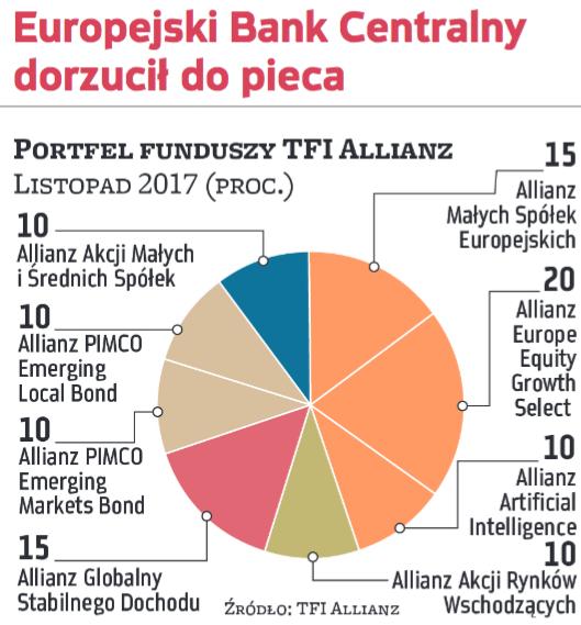 EBC ma kontynuować program skupu obligacji. Ta decyzja jest argumentem zarówno za osłabieniem euro, jak i za dalszym wzrostem cen aktywów, zwłaszcza na Starym Kontynencie. Dlatego w portfelu zwiększamy udział funduszy: Allianz Małych Spółek Europejskich i Allianz Europe Equity Growth Select. Umocnienie euro, do którego doszło w ostatnich miesiącach, nie zaszkodziło szczególnie wynikom spółek z Europy, ewentualne osłabienie waluty może im natomiast pomóc. Większy udział akcji zachodnioeuropejskich finansujemy, zmniejszając zaangażowanie w fundusze polskich „misiów" (które były pod presją odpływów z funduszy i suwaka w OFE) i obligacji dolarowych. Na rynkach instrumentów dłużnych inwestorzy mogą szukać tych miejsc, w których wciąż można znaleźć atrakcyjne oprocentowanie, nawet kosztem wyższego ryzyka – decyzja EBC może zachęcić ich do dalszego kupowania obligacji krajów rozwijających się. Chcąc to wykorzystać, utrzymujemy w portfelu fundusze obligacji emerging markets – wymienia Łukojć. W październiku jego inwestycja wyszła na zero.