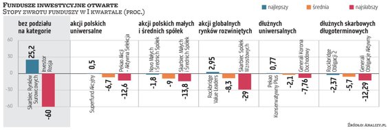 W efekcie po I kwartale w tabeli wyników produktów oferowanych przez TFI zdecydowanie przeważa kolor czerwony – wynika z danych serwisu Analizy.pl. Rynkową zawieruchę najmocniej odczuli inwestujący w produkty z ekspozycją na rynek rosyjski, choć zapewne nie wszyscy z nich byli na to gotowi. Niechlubnym przykładem jest Generali Korona Dochodowy, czyli fundusz dłużny uniwersalny, który I kwartał kończy ze spadkiem o 7,76 proc. i jednocześnie na ostatnim miejscu w grupie. Dodajmy, że przeciętny wynik w tej kategorii po trzech miesiącach to 2,1 proc. straty, natomiast kilku funduszom udało się przynieść w tym okresie zyski.