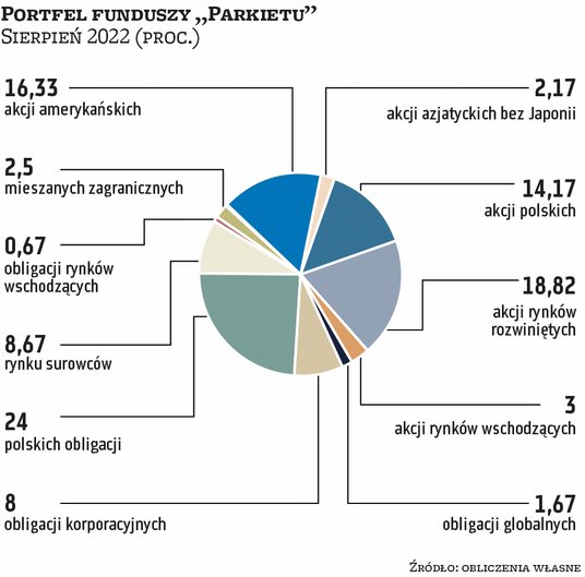 Ogółem zmiany w strukturze portfeli funduszy prowadzonych przez szóstkę ekspertów, o ile występują, są w sierpniu kosmetyczne. Warto odnotować wzrost pozycji funduszy akcji amerykańskich o 3,3 pkt proc., do 16,3 proc. Stało się to kosztem funduszy akcji globalnych rynków rozwiniętych oraz polskich obligacji skarbowych. Te ostatnie nadal jako grupa będą mieć największy wpływ na wyniki, bo ich udział nadal sięga aż 24 proc. Kolejną kategorią będą wspomniane fundusze akcji rynków rozwiniętych. Łącznie fundusze akcji będą w tym miesiącu odpowiadać za 55 proc. aktywów portfela funduszy „Parkietu”.