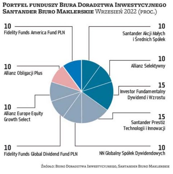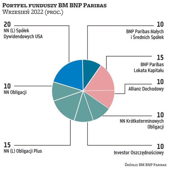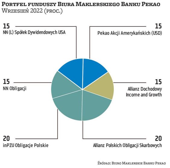 Utrzymujemy skład naszego portfela bez zmian. Lekkie cofnięcie obligacji w sierpniu nie jest jeszcze dla nas powodem do zmiany nastawienia do tej klasy aktywów. Wciąż dług jest dla nas najbardziej atrakcyjnym inwestycyjnie segmentem rynku finansowego w aktualnym otoczeniu gospodarczym, dlatego ulokowaliśmy w nim aż 70 proc. wartości naszego portfela. Inflacja w Polsce zaskoczyła negatywnie, rosnąc do poziomu ponad 16 proc. rok do roku, jednak sądzimy, że przestrzeń do dalszego jej przyspieszania jest ograniczona, a co za tym idzie rentowności obligacji nie powinny dalej rosnąć. Ryzykiem są kolejne podwyżki stóp, jednak sądzimy, że cykl zacieśniania monetarnego się kończy. Gospodarka znajduje się aktualnie pod dużą presją szoku inflacyjnego, szczególnie w obrębie cen żywności i paliw. Ograniczenia konsumpcji, produkcji i inwestycji stają się faktem, co będzie negatywnie oddziaływało na zyski firm. Nie oczekujemy szybkiej poprawy otoczenia gospodarczego, dlatego akcje mają stosunkowo niski udział w naszym portfelu (30 proc.). Zwracamy uwagę, że wybraliśmy wyłącznie akcje z rynku amerykańskiego, gdyż uważamy, że USA najłagodniej przejdą przez aktualną recesję. Utrzymujemy też ekspozycję na USD, co dotychczas pozwalało w znacznym stopniu rekompensować spadki rynku akcji.