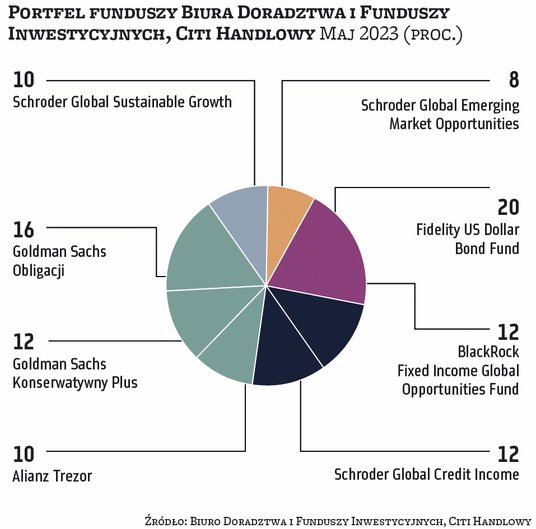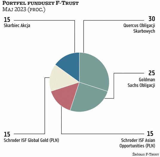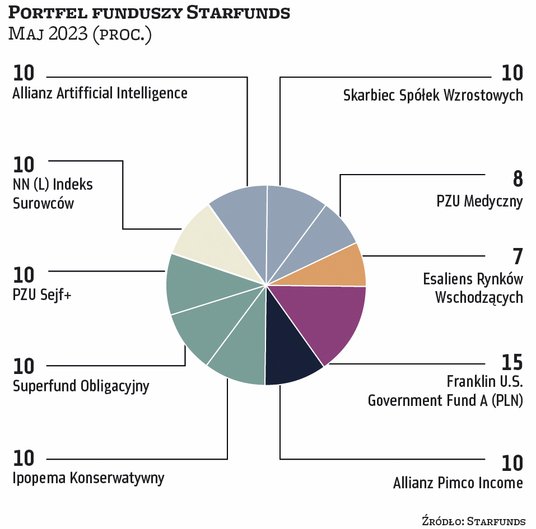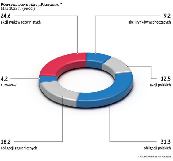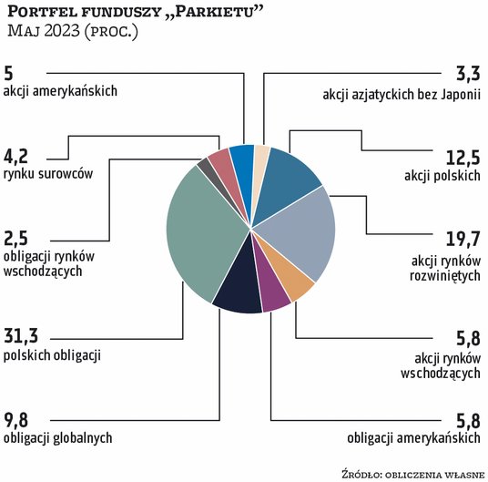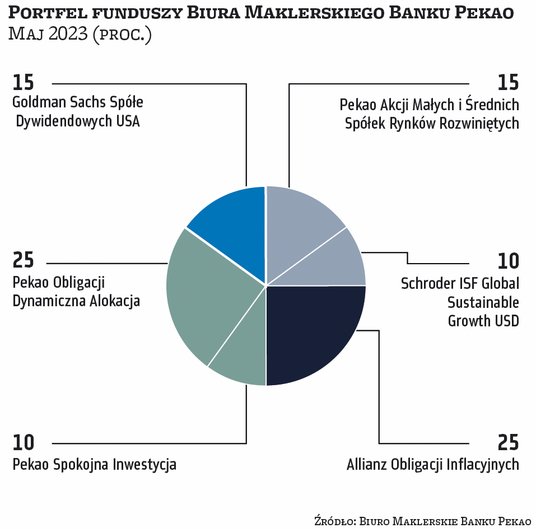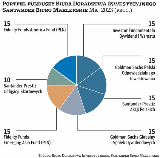 Pogorszenie gospodarcze jednak nie odbija się na rynkach akcji. Kwiecień z reguły dla inwestorów był udanym miesiącem. Na wartości zyskiwała większość rynków akcji (w Polsce szczególnie duże spółki) oraz fundusze obligacji. Z tych pierwszych nieliczne wpadki zdarzyły się wśród funduszy akcji spółek technologicznych. Dlatego większość zarządzających portfelami funduszy, które co miesiąc publikujemy na łamach „Parkietu”, przyniosła zyski. Najlepiej w zeszłym miesiącu zachował się portfel ekspertów BM Santandera, wyraźnie przechylony w stronę polskich akcji – tego typu fundusze zajmowały aż 45 proc. aktywów. Na maj BM Santandera podtrzymuje zarówno tę pozycję, jak i pozostałe. Jak mówią analitycy, mimo że perspektywy co do wzrostu gospodarczego na kluczowych rynkach nie są jasne, to prawdopodobieństwo, że zbliżamy się do zakończenia cyklu podwyżek stóp procentowych po obu stronach Atlantyku, jest spore. Stąd decyzja o pozostawieniu portfela w dotychczasowym składzie.