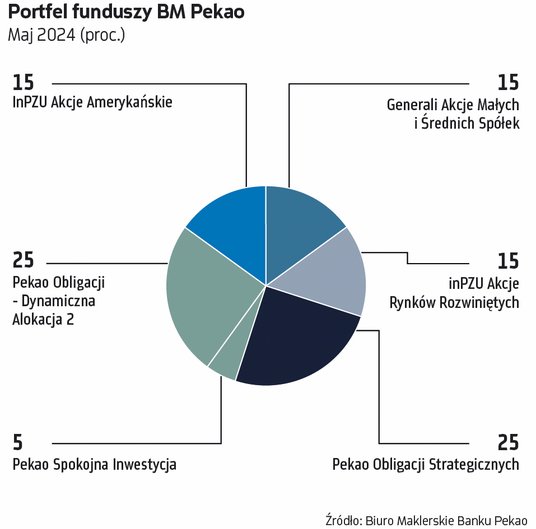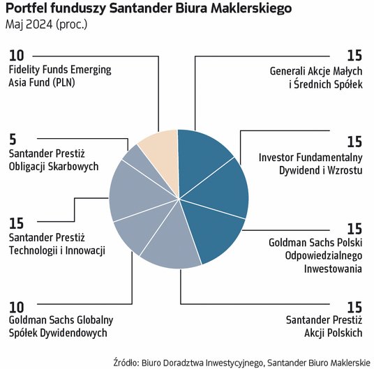 O dodatni wynik za zeszły miesiąc otarł się jeszcze portfel prowadzony przez BM Santandera, w dużym stopniu dzięki funduszom polskich akcji. Co ciekawe, w maju udział funduszy akcji polskich w portfelu BM Santandera pozostaje na poziomie 60 proc. i jest to oczywiście najwięcej z całej szóstki portfeli funduszy zaprezentowanych poniżej.