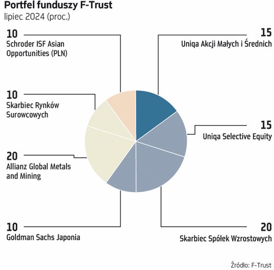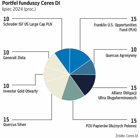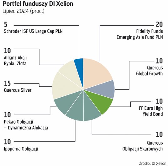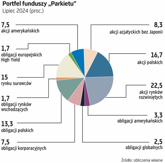 Nie wszyscy zarządzający portfelami funduszy, które co miesiąc publikujemy na łamach „Parkietu”, skorzystali z okazji do zmian w strukturze inwestycji z początkiem lipca. Postąpili tak m.in. eksperci BM Santandera, który aż 60 proc. aktywów utrzymuje w polskich akcjach (z 95 proc. w akcjach łącznie). Ich zdaniem polski rynek dalej ma potencjał do umocnienia, a wskaźniki wyceny pozostają na atrakcyjnych poziomach. Według BM Santandera kolejna fala wzrostowa mogłaby się pojawić na rodzimym rynku w przypadku większej poprawy nastawienia inwestorów do rynków wschodzących, a także w przypadku obniżenia się napięć geopolitycznych w rejonie Europy Środkowo-Wschodniej. Ale już Kamil Cisowski z DI Xelion zdecydował się „tymczasowo” wyjść z krajowego rynku. Jest jednak przekonany o świetnych perspektywach polskich obligacji. Jak zauważa, w ciągu ostatnich dwóch miesięcy nie działo się na tym rynku wiele, co oznacza, że wciąż wygląda on słabo na tle funduszy o niskiej duracji, ale w II półroczu ma się to zmienić. – Rentowność polskiego długu ma potencjał do spadków, nawet jeżeli konserwatywna retoryka RPP się nie zmieni – spodziewamy się dwóch obniżek w USA i jeszcze trzech w Europie – zakłada ekspert DI Xeliona.