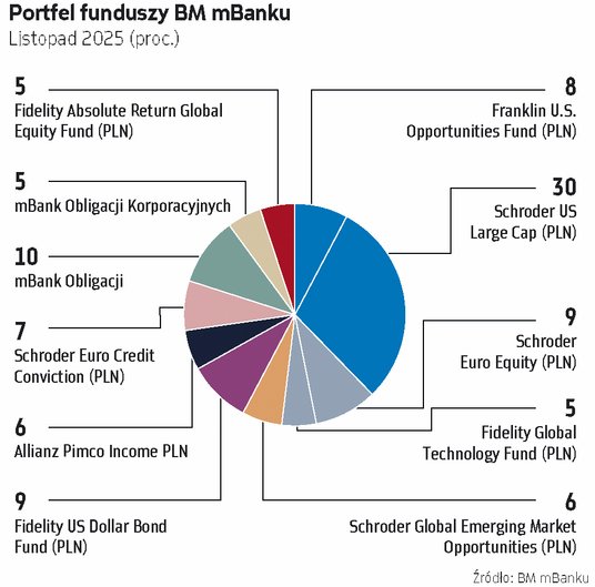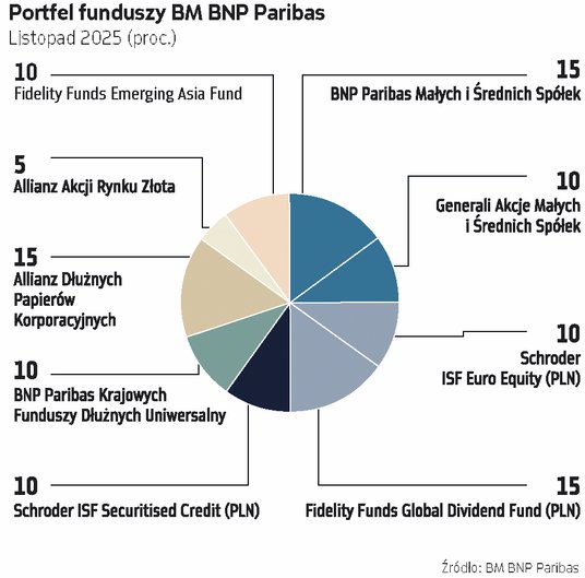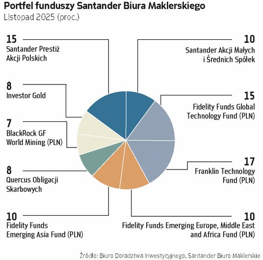 Średni udział akcji ogółem w listopadzie będzie odrobinę wyższy w porównaniu z poprzednim miesiącem i sięgnie 54,4 proc. Jeśli chodzi o poszczególne rynki, to zmiany są kosmetyczne i niemal wyłącznie w ramach rynków wschodzących. Nie zmienia się m.in. udział funduszy akcji polskich, utrzymany na 12,5 proc. Nic dziwnego – krajowy rynek akcji wyszedł z tarapatów i dołączył do innych indeksów bijących tegoroczne szczyty hossy. Nastawienie do polskich akcji bywa jednak różne. W dwóch portfelach odpowiadają one za 25 proc. aktywów, natomiast w jednym – BM mBanku – bezpośrednio nie znajdziemy ich wcale. Na polskie akcje liczą za to szczególnie eksperci BM BNP Paribas BP oraz BM Santandera. – Rynek akcji krajowych, zgodnie z naszymi oczekiwaniami, po korekcie notowań powrócił do wzrostów i pomimo tego postrzegamy go nadal jako relatywnie dość atrakcyjnie wyceniony – tłumaczy Piotr Tukendorf, zarządzający portfelami, BM Santandera.