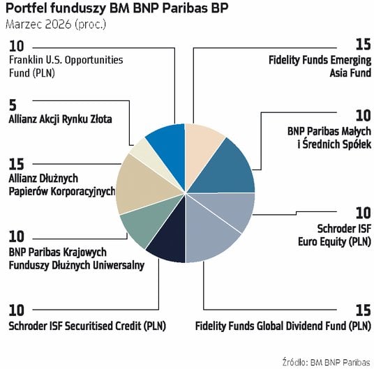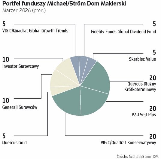 W marcu ze względu na sytuację na Bliskim Wschodzie nasz portfel zostaje znacząco przebudowany. Redukujemy ryzyko zarówno w zakresie funduszy akcji jak i dłużnych. W ramach części akcyjnej zostają sprzedane fundusze akcji polskich i rynków wschodzących: Uniqa Akcji Małych i Średnich Spółek, Fidelity Funds Emerging Europe, Middle East and Africa Fund oraz Schroder Global Emerging Market Opportunities, łącznie za 30 proc. aktywów portfela. Z części dłużnej pozbywamy się funduszy o podwyższonej duracji oraz ryzyku kredytowym: Rockbridge Obligacji oraz Allianz Pimco Global High Yield Bond.