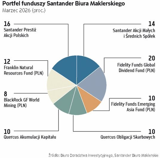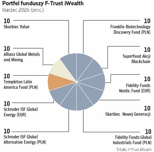Pozytywne dane makroekonomiczne oraz wzrost ryzyka geopolitycznego pozwoliły zapomnieć o styczniowej przecenie na metalach szlachetnych. Po raz kolejny lepiej poradziło sobie srebro, które wzrosło o ponad 10 dolarów za uncję, co pozwoliło osiągnąć niemal 13-proc. stopę zwrotu.Eskalacja konfliktu na Bliskim Wschodzie z ostatniego dnia lutego stanowi jednak dla nas podstawę do otwarcia pozycji w funduszu z istotnym udziałem surowców energetycznych. Do portfela kupujemy więc Schroder ISF Commodity (PLN), sprzedając tym samym srebro i ograniczając udział polskich obligacji skarbowych. Dokonujemy również niewielkiego przesunięcia w stronę akcji amerykańskich, których udział zrównujemy z funduszem małych i średnich polskich spółek.