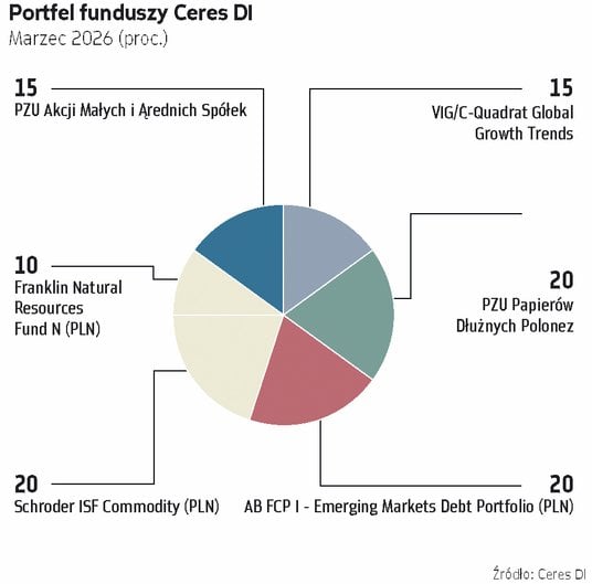 Łącznie za 30 proc. portfela nabywamy też fundusze dłużne krótkoterminowe: VIG C Quadrat Konserwatywny oraz zwiększamy zaangażowanie w Quercusie Dłużnym Krótkoterminowym i PZU Sejf Plusie. Po zmianach portfel składa się w 15 proc. z funduszy akcji, w 60 proc. z funduszy dłużnych oraz w 25 proc. z funduszy surowców.