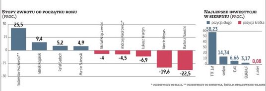 W sierpniu straty przyniosły pozycje walutowe. Eksperci stawiali głównie na umocnienie dolara, jednak amerykańska waluta była słabsza do euro czy złotego. Podobnie chybione były prognozy dotyczące indeksów giełdowych, szczególnie amerykańskich, dla których sierpień był najlepszym miesiącem od lat. Nasdaq zyskał około 11 proc., a S&P 500 około 7 proc.