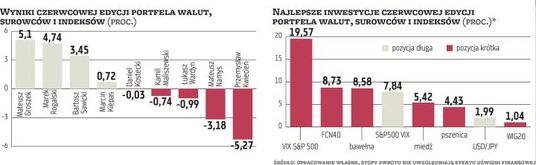 Koniec I połowy roku to dobry czas na podsumowanie sześciomiesięcznych wyników. Na prowadzeniu jest wspomniany Groszek, którego portfel od początku roku zarobił ponad 25 proc. Następny jest Bartosz Sawicki, który w tej edycji portfela dla walut, surowców i indeksów uczestniczy dopiero od trzech miesięcy. Krótki okres nie przeszkodził mu jednak w wypracowaniu dobrego wyniku, czyli prawie 9 proc. zysku. Nieco gorsze rezultaty zanotowali Marcin Kiepas, Mateusz Namysł z Raiffeisen Polbanku oraz Marek Rogalski z DM BOŚ. A co powinno przynieść zyski w lipcu?