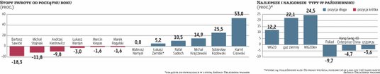 Na brak emocji rynkowych w październiku zdecydowanie nie można było narzekać. Na globalnym rynku straszyła perspektywa eskalacji konfliktu na Bliskim Wschodzie, ale także rosnące rentowności obligacji skarbowych, które przyczyniły się do odwrotu od ryzykownych aktywów. W przypadku dziesięcioletnich papierów w Stanach Zjednoczonych przebity został nawet na chwilę poziom 5 proc. Po złamaniu tej bariery rozpoczęła się jednak korekta, która dała nieco wytchnienia rynkom. Hitem z kolei okazał się być polski rynek akcji, a także złoty. Wszystko to oczywiście efekt powyborczej euforii nad Wisłą. Części ekspertów typujących skład portfeli foreksowych udało się zresztą załapać na ten ruch i ich październikowe typy przyniosły okazałe stopy zwrotu.