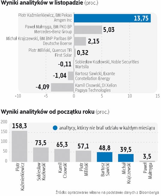 Na miejscu trzecim w klasyfikacji po 11 miesiącach plasuje się z kolei Kamil Cisowski z DI Xeliona, który na ostatni miesiąc roku postawił - jak sam przyznaje - najbardziej ryzykowny zakład tego roku, czyli południowoamerykańską spółkę wydobywającą głównie srebro. Tego rodzaju przedsiębiorstwa to oczywiście jedna z najlepszych inwestycji powoli mijającego roku. Czy grudzień także może przynieść wzrosty? - Dotychczasowa tegoroczna stopa zwrotu może oczywiście przerażać, ale z perspektywy krótkoterminowej spółka nie zachowuje się w sposób, który sugerowałby nadmierne wykupienie na tle ceny surowca - komentuje Cisowski.