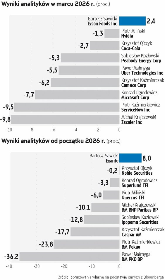 Eksperci nie zapominają także o sektorze półprzewodników. Michał Krajczewski z BM BNP Paribas BP wybrał na ten miesiąc francuski Soitec, producenta i sprzedawcę płyt krzemowych, mającego – w jego przekonaniu – już za sobą kilkuletni trend spadkowy. Ostatnie tygodnie były ciężkie nie tylko dla rynków akcji, ale i metali szlachetnych, a to pociągnęło za sobą ostrą przecenę firm związanych z wydobyciem czy sprzedażą złota i srebra. Eksperci liczą jednak na kontynuację wielomiesięcznego trendu wzrostowego. Bartosz Sawicki z Exante, który może pochwalić się najlepszą stopą zwrotu w portfelu po I kwartale, postawił w tym miesiącu na działające głównie w Meksyku Fresnillo. Jego zdaniem, po wymazaniu połowy rozpoczętej w III kwartale ub.r. zniżki, kurs próbuje zbudować formację odwrócenia trendu spadkowego. – Przebicie na pierwszych sesjach tego kwartału strefy 3300-3350 GBP oznacza aktywowanie podwójnego dołka, powrót ponad serię minimów z 7 stycznia, 2 lutego oraz 9 marca 2026 r. oraz przebicie 100-sesyjnej średniej kroczącej – wskazuje.