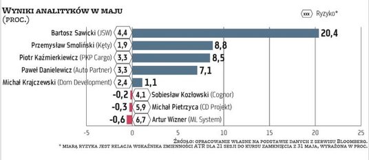 Popularne w giełdowym środowisku powiedzenie „Sell in may and go away" zupełnie się w tym roku nie sprawdziło. Parafrazując Wojciecha Białka, autora bloga finansowego „K(no)w future" – kto sprzedał, ten przegrał życie. Widać to po dorobku WIG-ów, a także po wynikach poszczególnych spółek z majowego portfela. Było ich w tym zestawieniu osiem i tylko trzy zakończyły miesiąc ujemnym wynikiem. Skala strat miała jednak wymiar kosmetyczny i wahała się od -0,16 proc. w przypadku Cognora do -0,61 proc. w przypadku ML Systemu. Pięć pozostałych podmiotów kończyło maj na plusie, a średni zysk wyniósł 9,2 proc. Średnią wyraźnie zawyża JSW. Akcje węglowej spółki podrożały w maju o 20,4 proc. To jedyny podmiot w zestawieniu, który pokonał benchmark. Typujący JSW Bartosz Sawicki, analityk Cinkciarz.pl, wskoczył dzięki temu na piąte miejsce w rankingu typujących. Szczegóły dotyczące JSW i wyników eksperta są na stronie obok.