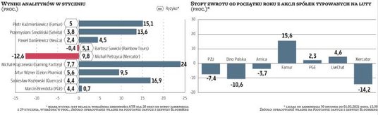 Dwie pozostałe spółki kończyły styczeń pod kreską. Zdecydowanie najsłabiej wypadł Mercator. Gwiazda covidowej hossy wyraźnie w styczniu osłabła, tracąc 12,6 proc. Co ciekawe, typujący te spółkę Michał Pietrzyca z DM BOŚ postanowił utrzymać ją w lutowym portfelu. Ekspert, o czym więcej można przeczytać poniżej, uważa, że właśnie dobiega końca ostatnia, czwarta fala korekty spadkowej i na gruncie analizy technicznej można oczekiwać odbicia notowań w górę. Drugi styczniowy „słabeusz" to Rainbow Tours. W przypadku turystycznej spółki spadek ceny akcji był jednak symboliczny, bo wyniósł tylko 0,42 proc.