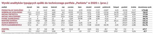 Przez cały ubiegły rok w typowaniu do portfela udział brało regularnie ośmiu analityków (regularnie oznacza, że ekspert nie opuścił więcej niż trzech miesięcy). Z tej ósemki piątka zakończyła 2020 r. na plusie, a trójka na minusie. Szczegółowe wyniki, końcowe i w poszczególnych miesiącach, widoczne są w tabeli na stronie obok.