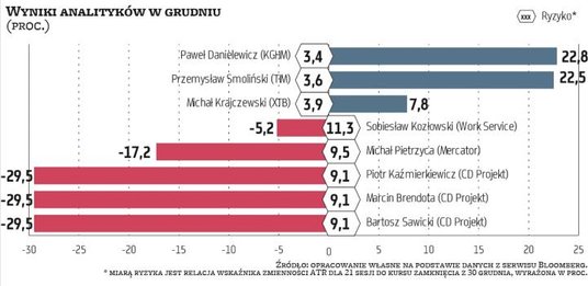 Na koniec słów kilka o ostatnim zestawieniu 2020 r. Otóż portfel techniczny stracił w grudniu 7,2 proc., podczas gdy WIG zyskał 8,3 proc. Był to więc czwarty miesiąc, gdy analitykom nie udało się pokonać benchmarku. W pozostałych ośmiu byli wyraźnie lepsi, dzięki czemu w ostatecznym rozrachunku wygrali różnicą 70,4 pkt proc. „Kulą u nogi" grudniowego portfela okazał się CD Projekt. Wskazało go trzech analityków, a była to najgorsza spółka w portfelu (akcje potaniały o 29,5 proc.). Pod kreską kończyły też miesiąc Mercator i Work Service. Na pozostałej trójce średni zysk wyniósł 17,7 proc., ale to za mało, by zniwelować straty pozostałych. Najlepszym analitykiem grudnia był Paweł Danielewicz z BM Santander, który wskazał KGHM i zarobił na nim 22,8 proc. Tuż za nim był triumfator całego roku – Przemysław Smoliński – który na TIM-ie wypracował 22,5 proc. zysku. Na trzecim miejscu był Michał Krajczewski, który wskazał XTB. Akcje brokera podrożały w grudniu o 7,8 proc. Szczegółowe wyniki analityków, a także opis najlepszej spółki grudnia znajdują się na wykresach obok.