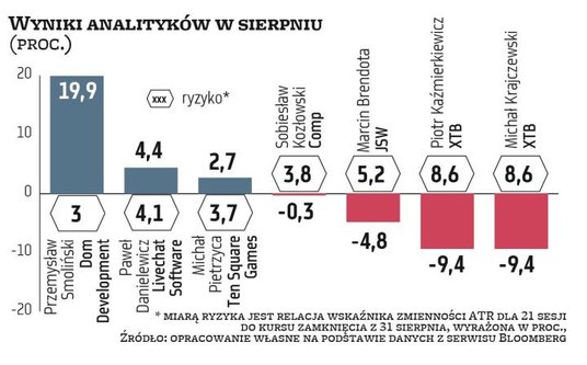 Ryzyko sierpniowego portfela, liczone jako relacja wskaźnika zmienności ATR dla 21 sesji do kursów zamknięcia z poniedziałkowej sesji, wyniosło 5,3 proc. Najbardziej „rozchwiany" był kurs XTB (8,6 proc.), a najmniej Dom Development (3 proc.). Dla porównania – zmienność WIG w sierpniu wyniosła tylko 1,3 proc. To uspokojenie może być przystankiem przed kolejnym „wybuchem" zmienności na naszym parkiecie. Pięciu analityków technicznych wskazało spółki, które mogą na realizacji takiego scenariusza skorzystać, a jeden postanowił we wrześniu trzymać w portfelu gotówkę zamiast akcji.