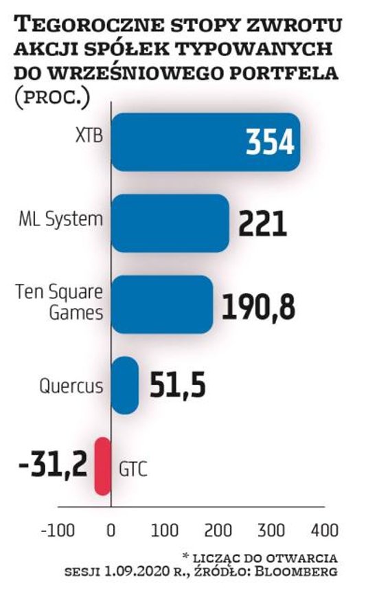 Zanim o wskazaniach na ten miesiąc, słów kilka o portfelu sierpniowym. W jego budowaniu wzięło udział siedmiu analityków. Dwóch wskazało tę samą spółkę – XTB, więc w zestawieniu było sześć podmiotów. Trzy przyniosły zysk o średniej wielkości 9 proc., a trzy były pod kreską, średnio -6 proc. Najsłabszym ogniwem poprzedniego zestawienia był wspomniany broker. Jego akcje potaniały o 9,4 proc., a że miał podwójną wagę, to stanowił największe obciążenie dla portfela. Na drugim biegunie znalazł się Dom Development. Spółka wskazana już trzeci raz z rzędu przez Przemysława Smolińskiego z BM PKO BP przyniosła stopę zwrotu 19,9 proc. (szczegóły na stronie obok).