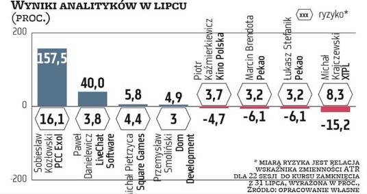 W tworzeniu lipcowego portfela udział wzięło ośmiu analityków. Dwóch wskazało tę samą spółkę, więc w zestawieniu znalazło się siedem podmiotów notowanych na głównym parkiecie warszawskiej giełdy. Cztery przyniosły dodatnią stopę zwrotu o średniej wielkości 52,1 proc. Wynik zawyżył wyraźnie PCC Exol, który dał zarobić w lipcu aż 157,5 proc. To rekord w całej historii naszej portfelowej symulacji. Spółkę wytypował Sobiesław Kozłowski z Noble Securities.