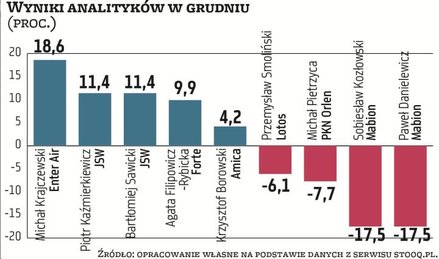 Zanim przejdziemy do portfela na styczeń 2020 r., najpierw podsumowania. Zacznijmy od grudnia. Przypomnijmy, że w ostatnim ubiegłorocznym typowaniu udział wzięło dziewięcioro analityków, a okres rozliczeniowy obejmował czas od zamknięcia sesji 29 listopada do zamknięcia sesji 3 stycznia. Dwie spółki – Mabion i JSW – otrzymały po dwa głosy (choć każdy typuje niezależnie), więc ich waga w portfelu była relatywnie wyższa. Efekt końcowy był taki, że na siedem typów trzy przyniosły stratę, a cztery zysk. Niestety, w feralnej trójce znalazł się Mabion, który był najsłabszym ogniwem zestawienia – jego walory potaniały o 17,5 proc. Straty na Lotosie i Orlenie były już znacznie niższe, odpowiednio -6,1 proc. i -7,7 proc. Biotechnologiczno-paliwowy ciężar udało się na szczęście zrównoważyć. Podwójnie typowana JSW w końcu zanotowała odbicie kursu i przyniosła zysk 11,4 proc. Ponadto najmocniejszy typ w stawce – Enter Air – zyskał aż 18,6 proc. (szczegóły na stronie obok). Doliczając do tego zyski: 9,9 proc. na Forte i 4,2 proc. na Amice, otrzymaliśmy uśredniony wynik portfela za grudzień na poziomie 0,7 proc. Rynek wypadł jednak lepiej. Napędzany efektami sezonowymi WIG wzrósł w analizowanym okresie o 1,9 proc. Jak wspominaliśmy, nie miało to wpływu na wyniki końcowe.