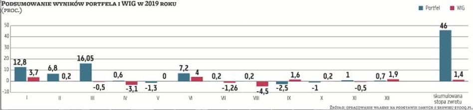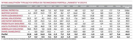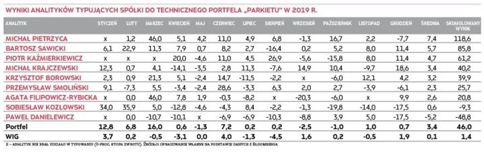 Nasz hipotetyczny portfel tworzyło dziewięcioro analityków. W większości przypadków frekwencja wynosiła 90–100 proc., choć zdarzały się miesiące z absencją kilku typujących (maksymalnie czterech nieobecnych w styczniu 2019 r.). Z tej dziewiątki siedmioro ekspertów zakończyło rok na plusie. Najlepsze wyniki (skumulowana stopa zwrotu) osiągnęli Michał Pietrzyca z DM BOŚ (118,6 proc.), Bartosz Sawicki z TMS Brokres (85,8 proc.) oraz Piotr Kaźmierkiewicz z DM Pekao (61,2 proc.). Najlepszym typem roku okazał się producent gier 11 bit studios. W marcu wytypowała go dwójka ekspertów (Agata Filipowicz-Rybicka z BM Alior Banku i wspomniany już Michał Pietrzyca), zgarniając po miesiącu 46-proc. zysk. Łącznie przez cały rok eksperci przesłali nam 98 typów. 60 proc. z nich przyniosła dodatni wynik w danym okresie rozliczeniowym, o średniej stopie zwrotu 10,4 proc. Pozostałe 40 proc. przynosiło średnio 8,1-proc. stratę.