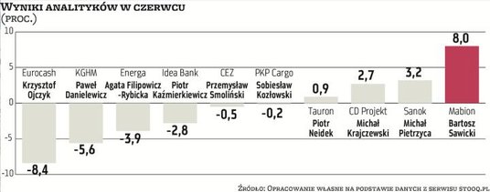 Zanim o nowych typach, podsumujmy krótko miniony miesiąc. W typowaniu do czerwcowego portfela udział wzięło dziesięcioro analityków. Każdy wskazał inną spółkę, więc wszystkie miały równe wagi – po 10 proc. każda. Niestety, tylko cztery spółki zamknęły miesiąc na plusie. Mowa o Tauronie, CD Projekcie, Sanoku i Mabionie. Ten ostatni był zdecydowanie najlepszy. Został wskazany przez Bartosza Sawickiego, analityka TMS Brokers, a jego wynik sięgnął 7,95 proc. (szczegóły obok). Pozostała szóstka kończyła czerwiec pod kreską. Przy tak niskiej trafności (40 proc.) kluczowa była relacja średniego zysku do średniej straty. Wyniosła ona 3,7 proc. do -3,6 proc., co pokazuje, że straty na nietrafionych wskazaniach były relatywnie niskie. Ostateczny wynik, 0,7 proc. pod kreską, można więc uznać za całkiem niezły. Nie tylko dlatego, że jest lepszy niż wynik WIG, ale także dlatego, że został osiągnięty na naprawdę trudnym rynku. Przypomnijmy, że sWIG80 i WIG20 przekroczyły w czerwcu umowne granice bessy, czyli straciły od szczytów poprzedniego trendu wzrostowego ponad 20 proc.