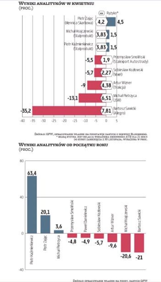 Niestety jedna z wymienionych wyżej spółek znalazła się w kwietniowym portfelu technicznym „Parkietu", przynosząc analitykowi stratę 35 proc. Był to zarazem najgorszy wynik w zeszłym miesiącu. Dwucyfrową stratę dała też Jastrzębska Spółka Węglowa i wraz z Allegro byli to jedyni przedstawiciele WIG20 w kwietniu. Warto zauważyć, że JSW była tuż po imponujących zwyżkach w I kwartale, jednak w kwietniu miała słabszy okres. Trzem analitykom udało się z kolei wypracować w tych ciężkich warunkach zyski. Najwyższą stopę zwrotu w kwietniu wypracował Piotr Zając z CMC Markets i było to blisko 4,5 proc. Średnia stopa zwrotu portfela w kwietniu to minus 7,6 proc., czyli o kilka pkt proc. wyżej od wyników głównych krajowych indeksów.
