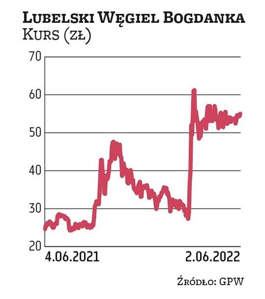 Wyniki te były zgodne z podanymi wcześniej przez Bogdankę szacunkami. LW Bogdanka na koniec 2021 r. miała 23,1 proc. udziałów w rynku węgla energetycznego w Polsce i 29,2 proc. w rynku węgla sprzedanego do energetyki zawodowej. Pod koniec maja zarząd LW Bogdanki poinformował, że chce przeznaczyć na wypłatę dywidendy 85 mln zł, co dałoby wypłatę w wysokości 2,5 zł na akcję. Pozostała część zysku z zeszłego roku – 206,56 mln zł – miałaby trafić na kapitał rezerwowy. Zarząd spółki zaproponował ustalenie 4 lipca jako dzień dywidendy oraz 20 lipca jako dzień wypłaty dywidendy. LW Bogdanka pojawiła się w portfelu technicznym „Parkietu" w maju, natomiast w czerwcu stawia na nią już dwóch analityków. W czwartek akcje Bogdanki zyskiwały 1,1 proc., do 55 zł.paan