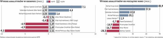W sierpniu WIG20 stracił 11,2 proc., a WIG – 8,8 proc. Indeks średnich spółek zanotował wynik odrobinę lepszy od WIG. Najbardziej odporny na zniżki okazał się sWIG80, który w zeszłym miesiącu stracił jedynie 1,4 proc. W tym warunkach portfel techniczny „Parkietu” poradził sobie całkiem nieźle. Średnia wyników analityków w sierpniu to tylko minus 0,8 proc., co na tle zniżek całego rynku można traktować jako niezłe osiągnięcie. W sierpniowej edycji portfela technicznego dwóch analityków postawiło na Dino Polska, które jednak – mimo zaprezentowania okazałych wyników kwartalnych – nie obroniło się przed naporem sprzedających. Akcje Dino kończyły zeszły miesiąc ze zniżką o blisko 5 proc. O obrazie całego miesiąca zdecydowały jednak ostatnie, słabe dni. Wcześniej dwukrotnie rynek zdołał wynieść notowania Dino na nowe rekordy. Sporo pod kreską zeszły miesiąc zakończyła najmniejsza ze spółek wybranych do sierpniowego portfela – Big Cheese Studio. Najmocniejszą pozycją okazały się walory LiveChat, które zyskały przeszło 7 proc. Na tę spółkę postawił Bartosz Sawicki z Cinkciarz.pl. Kolejny był Alior Bank, który znalazł się w portfelu technicznych z wyboru Sobiesława Kozłowskiego, dyrektora departamentu analiz i doradztwa, Noble Securities.
