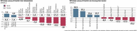 Przypomnijmy, że we wrześniu analitycy stawiali niemal wyłącznie na akcje małych i średnich spółek, a nawet sięgnęli do firm spoza głównych indeksów. Z perspektywy czasu trzeba przyznać, że ominięcie przedsiębiorstw z WIG20 było dobrym pomysłem, bo indeks dużych spółek okazał się najsłabszy. Firmy o mniejszej kapitalizacji w większości jednak nie zdołały ochronić przed utratą wartości kapitału. W czterech przypadkach straty były dwucyfrowe. Spośród propozycji z zeszłego miesiąca z dodatnim wynikiem finiszowały tylko Famur, który zwyżkował o ponad 7 proc., oraz LiveChat Software, który dał 4,4 proc. zysku. Blisko wyjścia na prostą był jeszcze Wielton. Średnia strata ze wszystkich dziewięciu propozycji sięgnęła 6,1 proc., co jest znacznie lepszym wynikiem niż stopy zwrotu WIG czy WIG20.